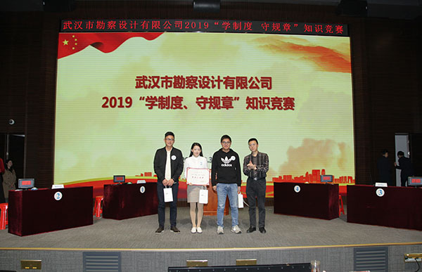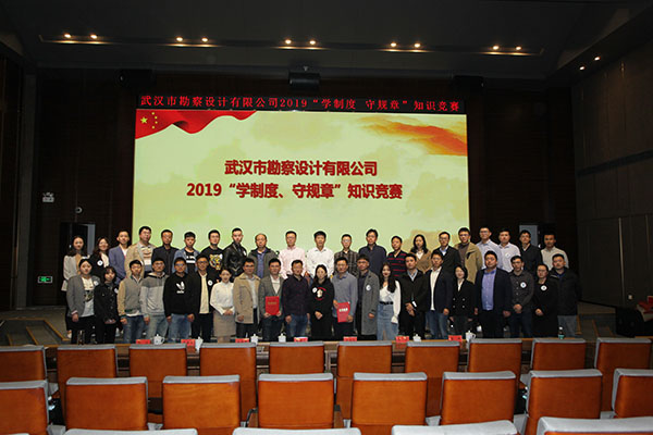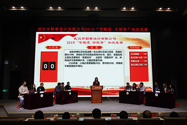 為進一步加強員工對公司企業(yè)文化及各項規(guī)章制度的學習和認識,提高員工的綜合素養(yǎng),10月30日上午,公司首次舉辦的2019年度“學制度 守規(guī)章”知識競賽活動在測繪院307學術(shù)報告廳成功舉辦。公司董事長廖建生,總經(jīng)理施木俊,副總經(jīng)理安永強、官善友、蔣濤,代理副總經(jīng)理熊劍,代理總會計師龔瑋親臨現(xiàn)場指導(dǎo)并觀看了比賽,公司各部門負責人及員工代表共計100余人參加了活動。巖土工程一公司、巖土工程二公司、測繪工程公司、基礎(chǔ)工程公司、檢測監(jiān)測公司、設(shè)計中心、地質(zhì)環(huán)境中心、不動產(chǎn)咨詢中心、東湖分公司、新區(qū)分公司、臨空分公司、土工試驗室等12支生產(chǎn)部門代表隊共36名選手參加了此次比賽。
