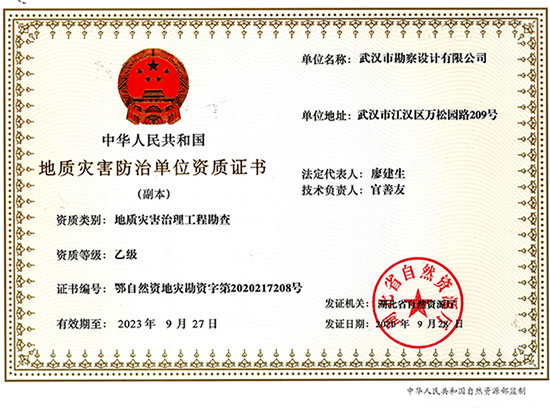 2020年9月28日,公司地質(zhì)災(zāi)害危險性評估、勘查、設(shè)計(jì)丙級升乙級資質(zhì)申報(bào)材料順利通過湖北省自然資源廳審核,并取得了地質(zhì)災(zāi)害危險性評估、地質(zhì)災(zāi)害治理工程勘查、地質(zhì)災(zāi)害治理工程設(shè)計(jì)乙級資質(zhì)證書,為公司今后能夠順利承接各類中小型地質(zhì)災(zāi)害危險性評估、勘查、設(shè)計(jì)業(yè)務(wù)等提供了更有力的保障。