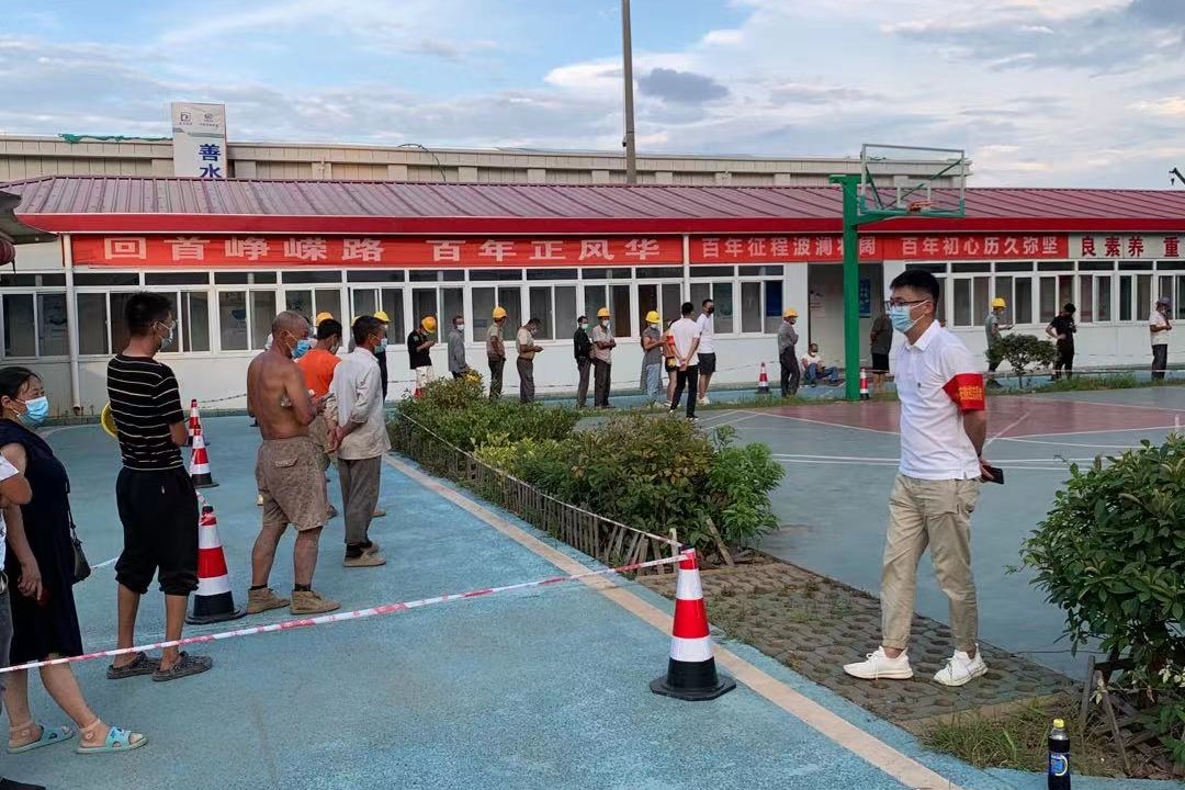 8月5日晚上18:00,公司黨員杜徐峰、宋友建、鄭暉、梅冬、余斌、陳澤風(fēng)、李子紅在社區(qū)工作調(diào)度下,來到黃家湖污水廠核酸檢測點(diǎn),協(xié)助做好核酸檢測工作。面對(duì)炎熱夏夜和蚊蟲叮咬,黨員們依然堅(jiān)守在檢測現(xiàn)場,熱情耐心地為該項(xiàng)目現(xiàn)場共計(jì)200余名工人,進(jìn)行信息登記、掃碼、維持現(xiàn)場秩序、講解檢測流程等,工作直至凌晨12點(diǎn)才結(jié)束。“我們處于與病毒賽跑的關(guān)鍵時(shí)刻,作為黨員,我們義不容辭要為這場戰(zhàn)斗添油助力!”黨員們紛紛表示道。