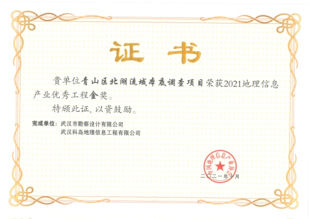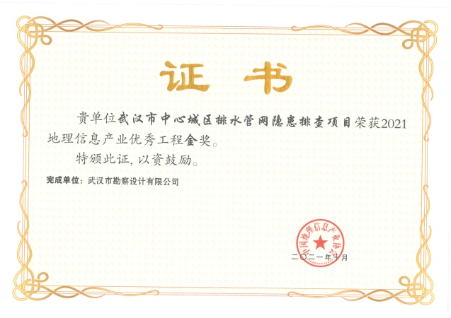 公司實施的“武漢市中心城區(qū)排水管網(wǎng)隱患排查項目”及“青山區(qū)北湖流域本底調(diào)查項目”憑借著先進的技術(shù)手段、優(yōu)良的數(shù)據(jù)成果及多項專利發(fā)明獲得了“2021年地理信息產(chǎn)業(yè)優(yōu)秀工程金獎”。