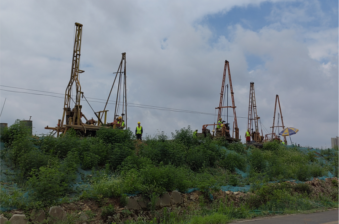 在施工勘察階段,根據(jù)業(yè)主要求,勘察需與施工同步進(jìn)行,彼時(shí)正值基坑開(kāi)挖,作業(yè)面少,但項(xiàng)目任務(wù)重、時(shí)間緊。在接到業(yè)主進(jìn)場(chǎng)通知后,團(tuán)隊(duì)迅速召集了近百臺(tái)鉆機(jī)及相關(guān)作業(yè)人員,就作業(yè)面少問(wèn)題,團(tuán)隊(duì)人員不斷與施工總包方溝通協(xié)調(diào)并制定施工、勘察方案,最終通過(guò)團(tuán)隊(duì)的拼搏努力及與總包方的密切配合,順利完成了施工勘察任務(wù)。